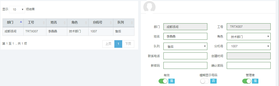 在工号管理模块可进行相关操作,修改密码,姓名等客户信息,配置工号的有效性,模块显示号码,是否是管理员工号等: