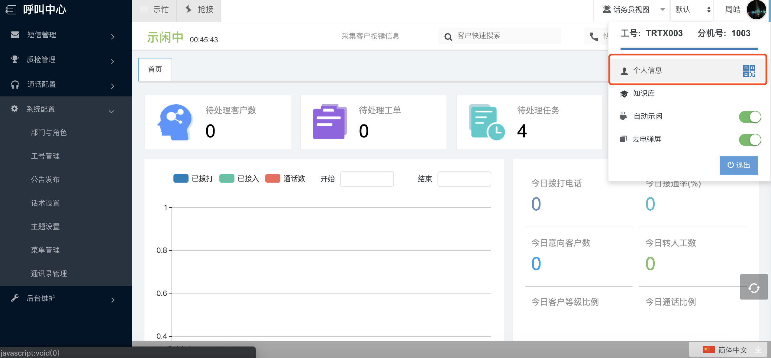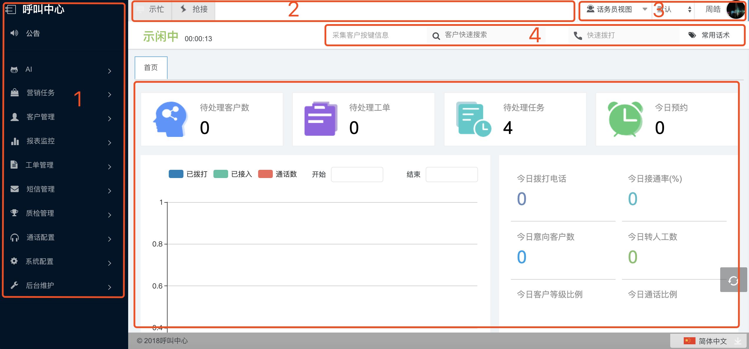 进入web 页面可看到系统首页,1是功能菜单树,2是话务条,3是个人信息,4是快捷操作,5是个性化视图。