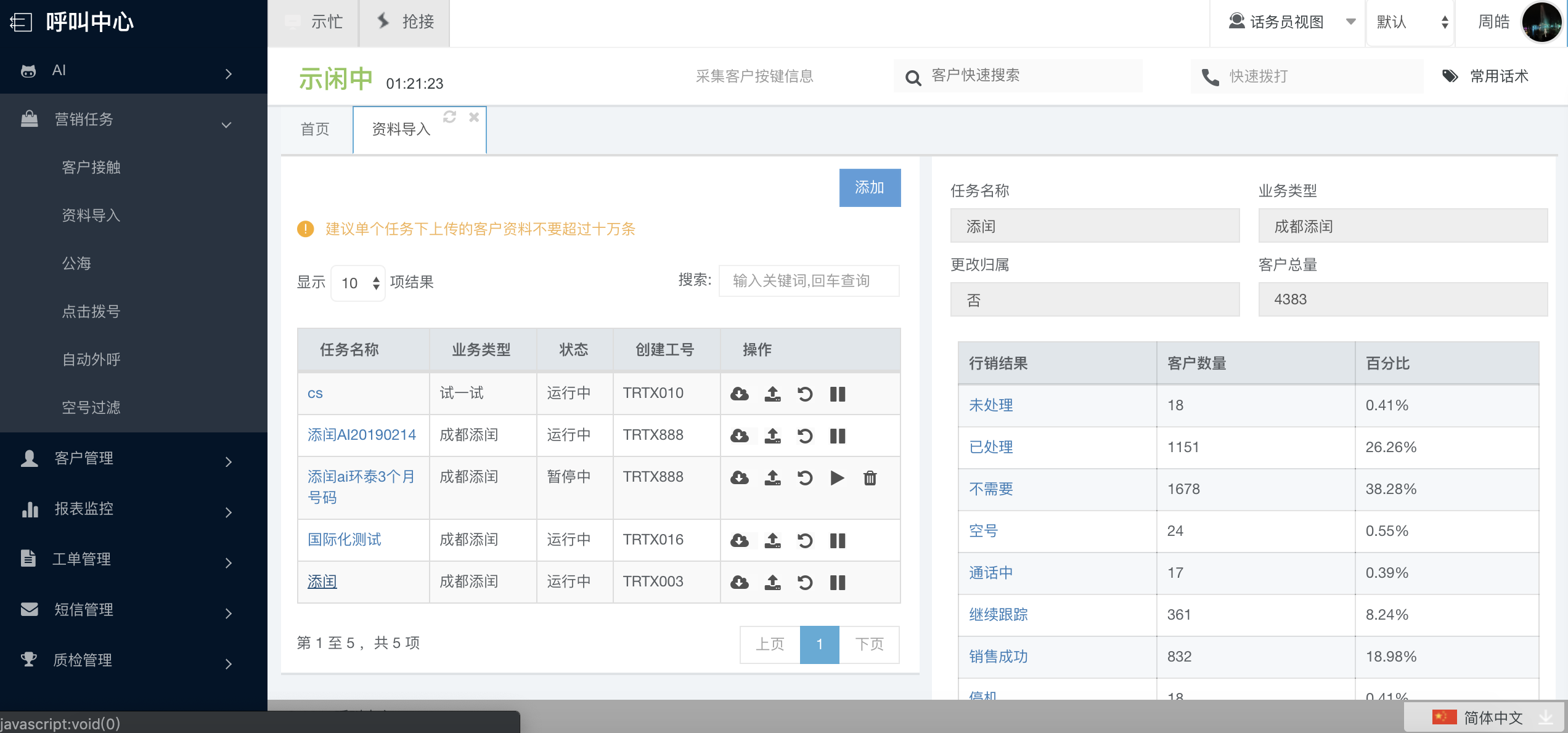 客户任务建立好之后,需要启动。只有启动的的任务才能在客户资料中被查看,以及作为外呼任务或自动外呼任务来执行其他的工作。启动状态下的任务可以停止。停止的任务可以删除。删除会连带删除这个任务下的客户资料,不可恢复。