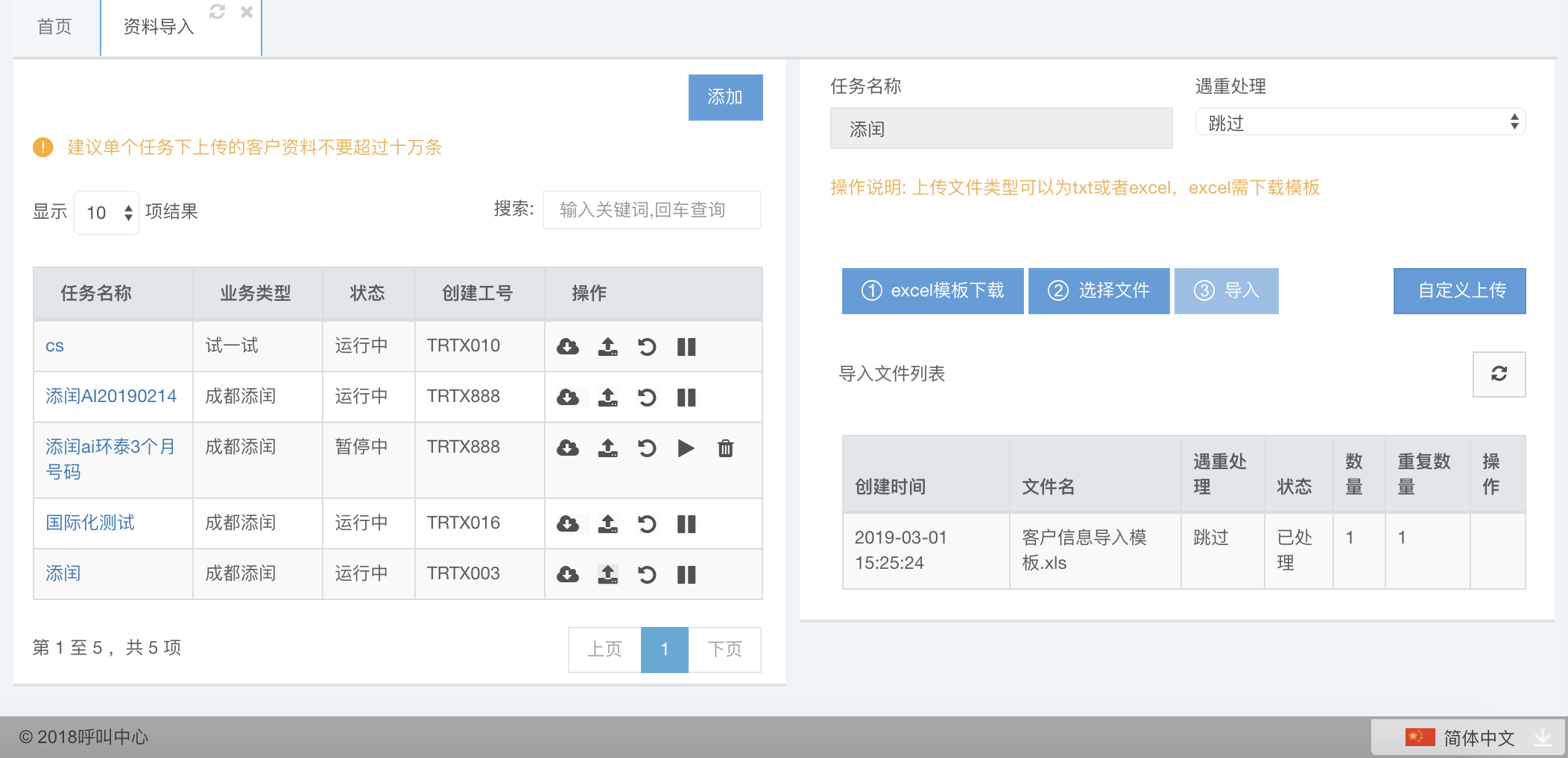 此时再查看任务情况,可以看到这个任务里面已经有数据了。点击上传按钮,可以追加导入。