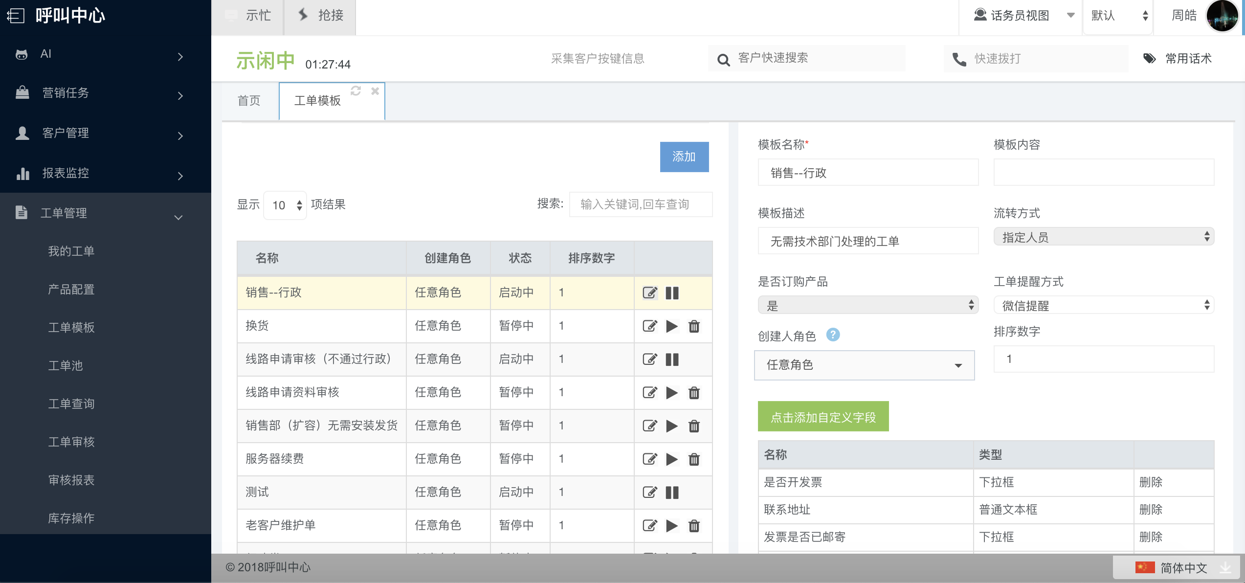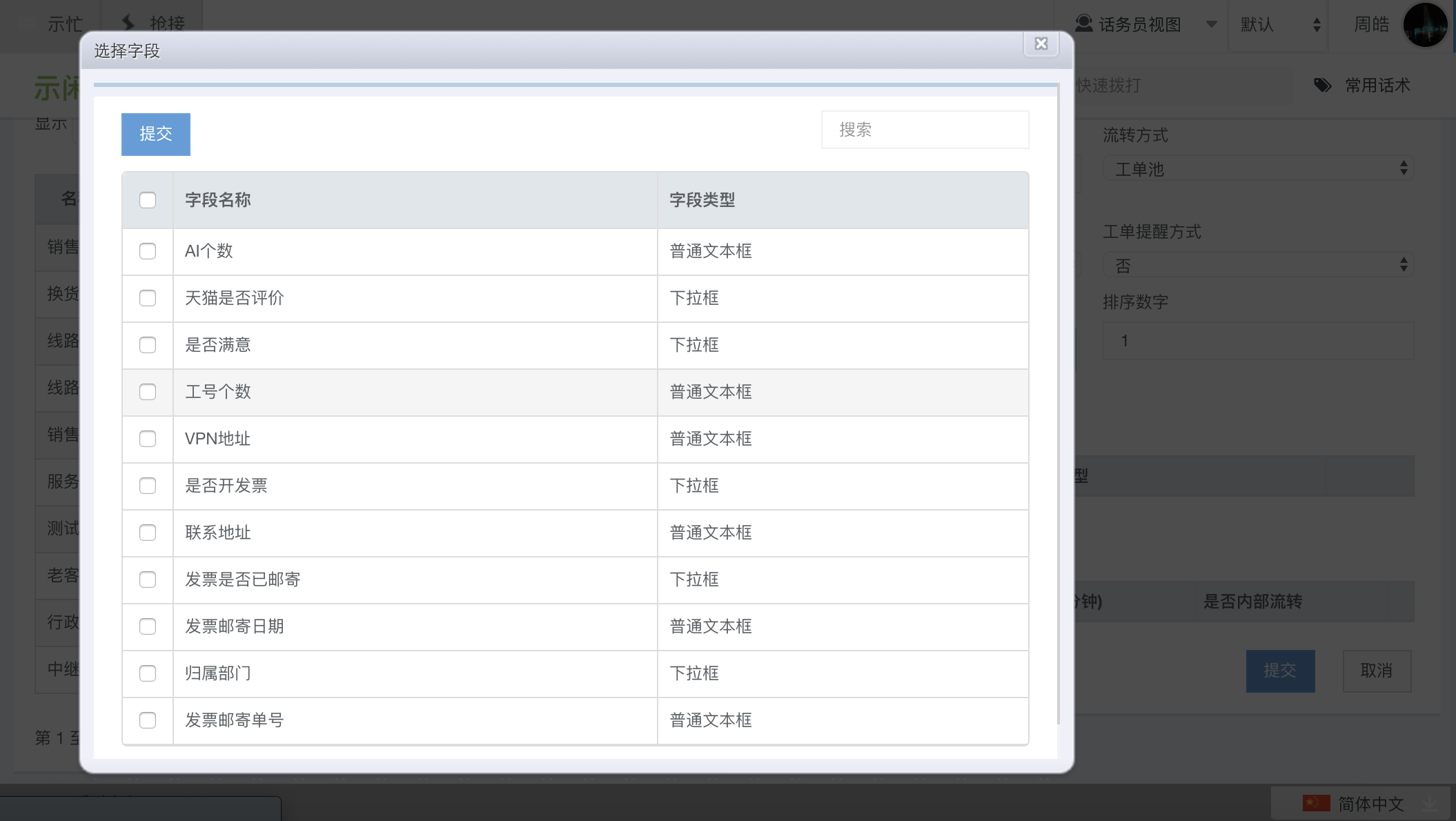 点击“添加自定义字段”,可以选择在“字段配置”模块配置的类型为“工单”的字段。