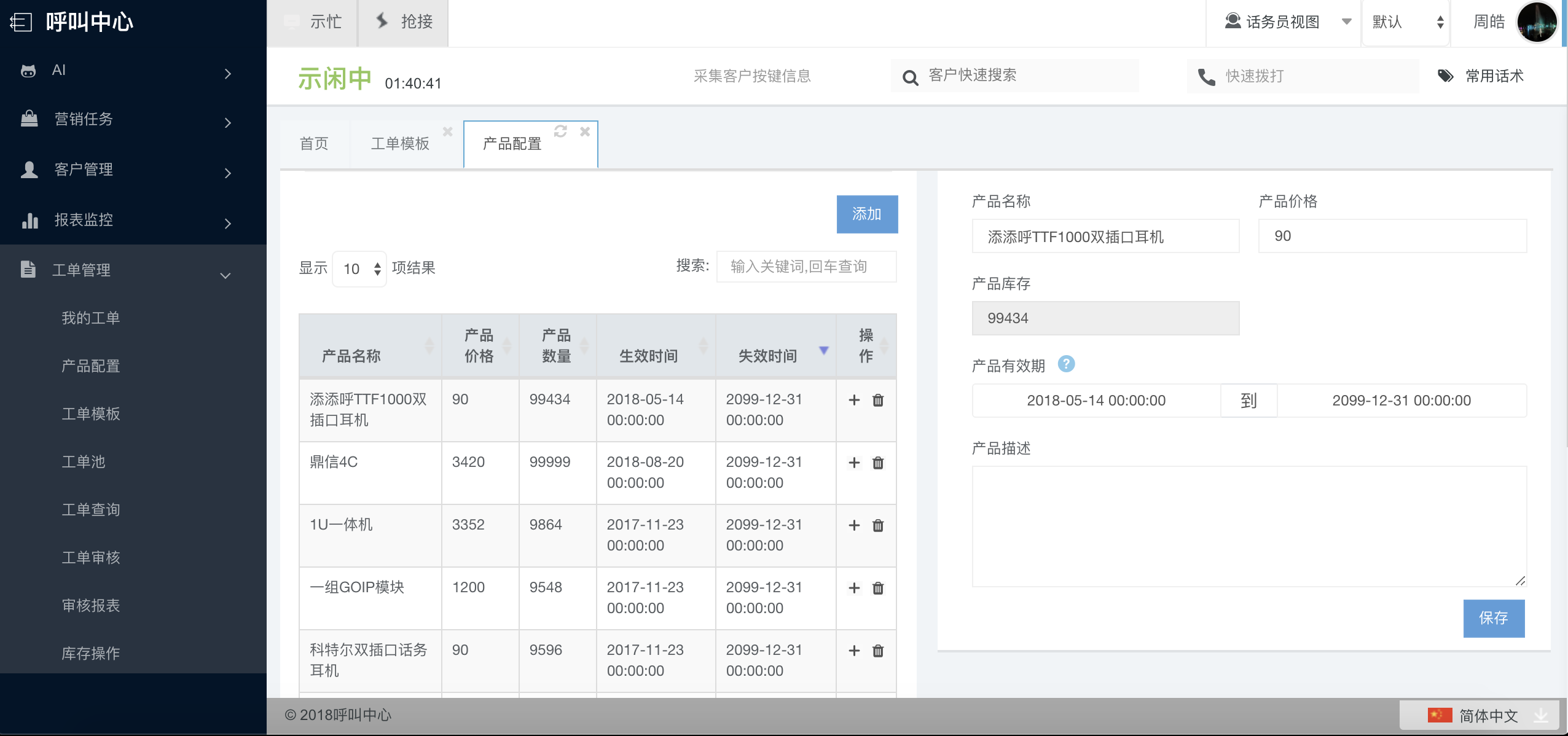 如果工单中涉及到订购产品,那么我们需要配置一些产品。通过菜单树“工单管理—产品配置”进入。点击添加,在右边的编辑页面编辑产品属性。