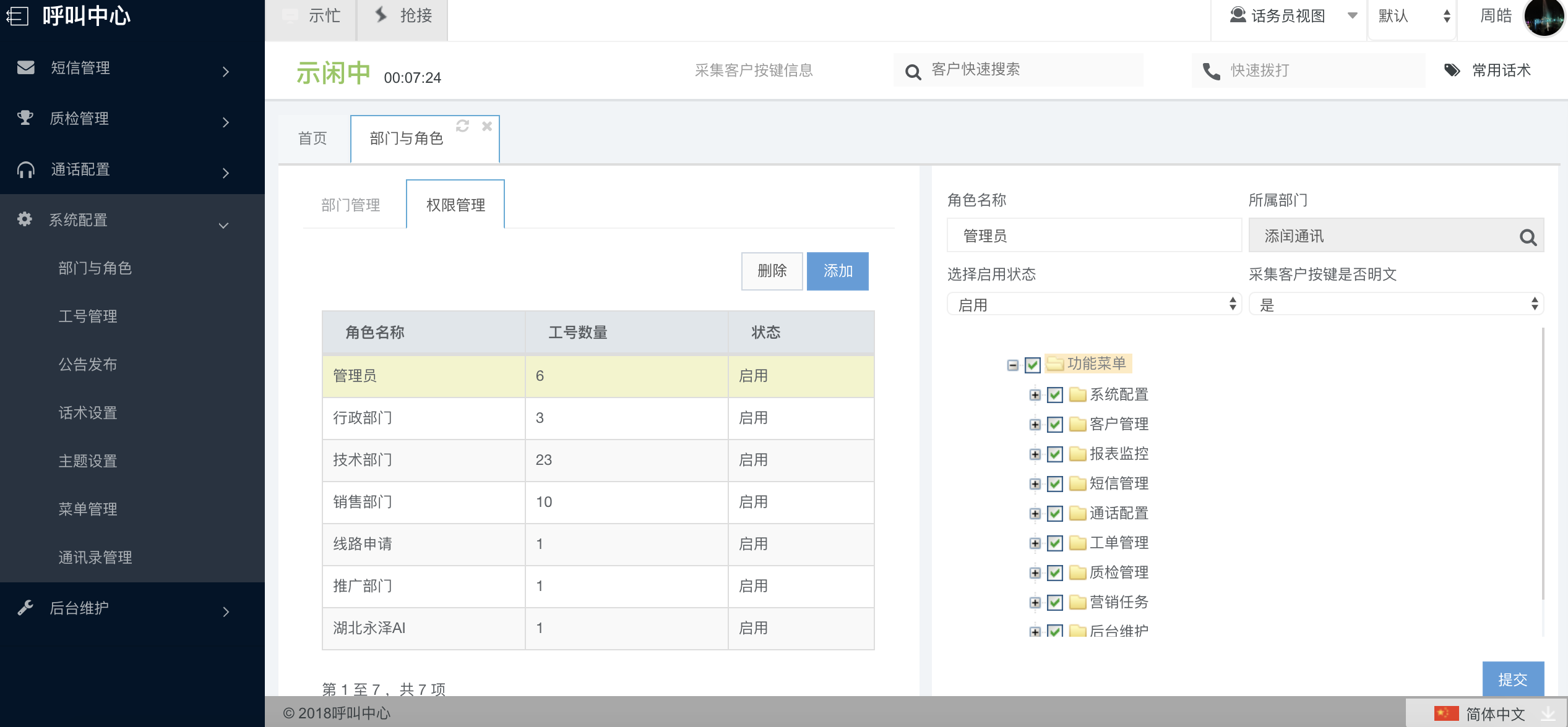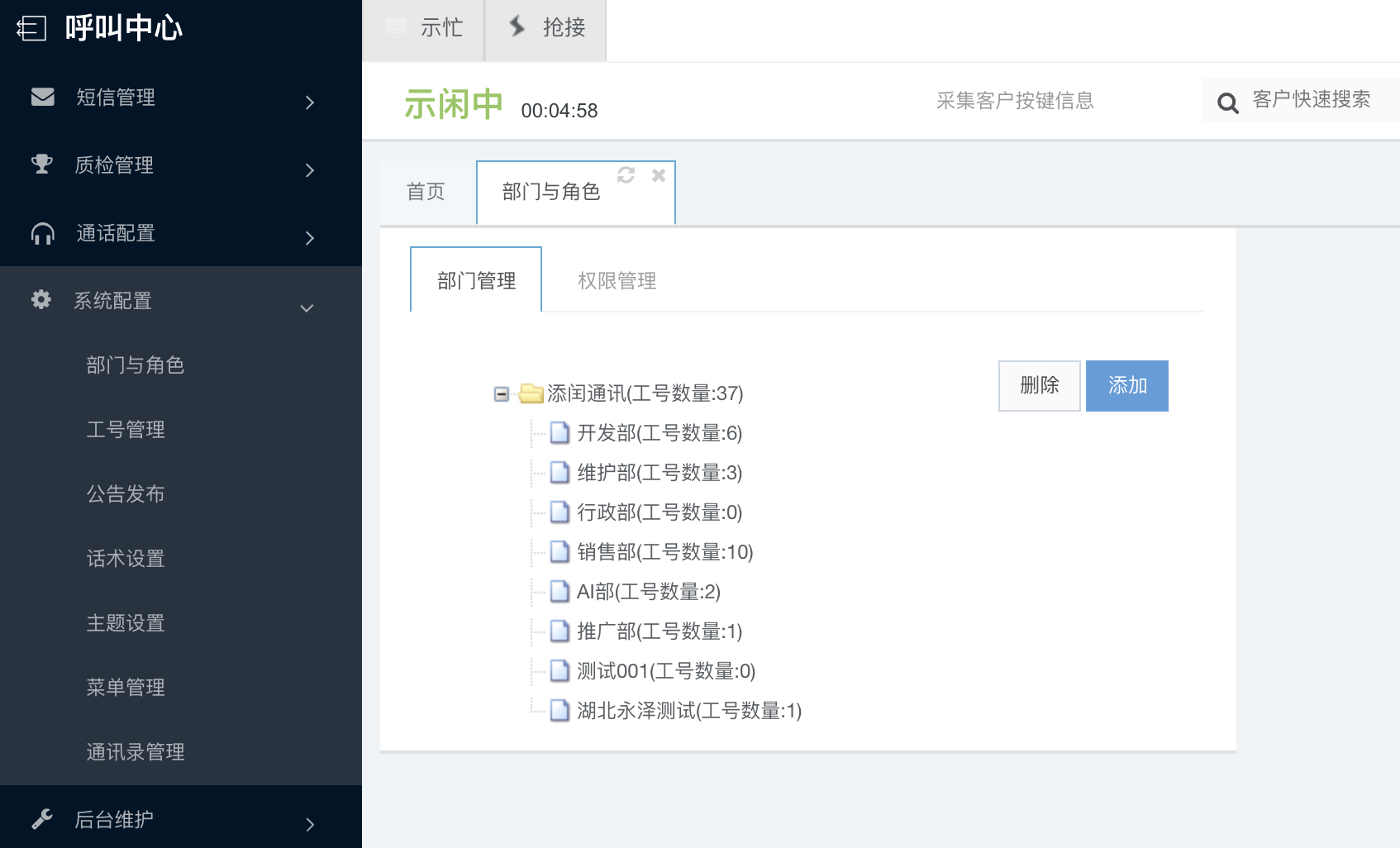 管理员在初次使用系统时,可根据自己企业的部门架构来设置组织树,系统默认一级组织为呼叫中心,此名称可变更。通过菜单树“系统配置--部门与角色”进入,选择“部门管理”。