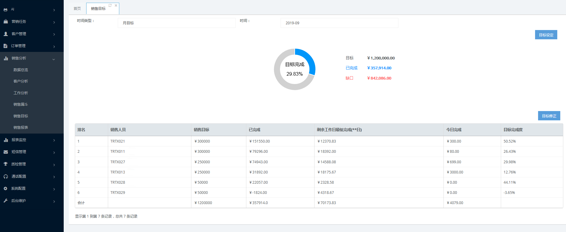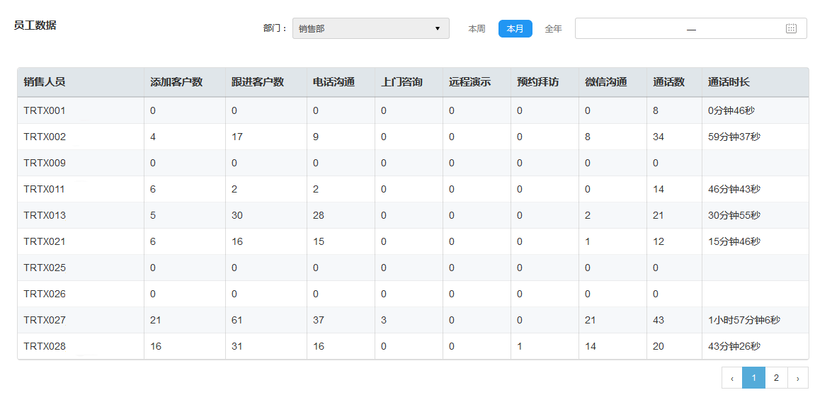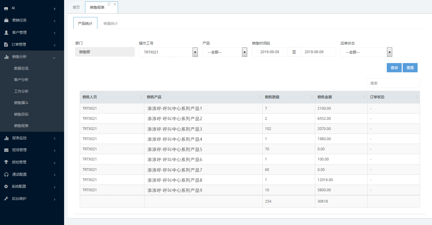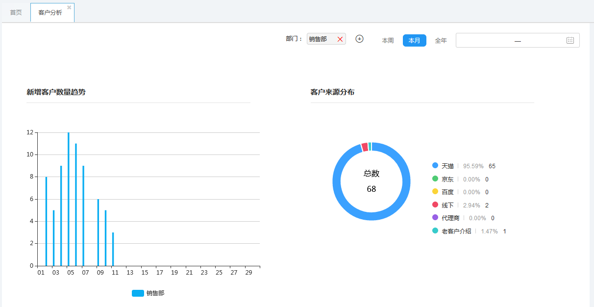 此模块可以统计客户在员工、部门的分布情况以及客户的处理情况。查询条件有部门,工号,按员工统计,按部门统计,分配时间。