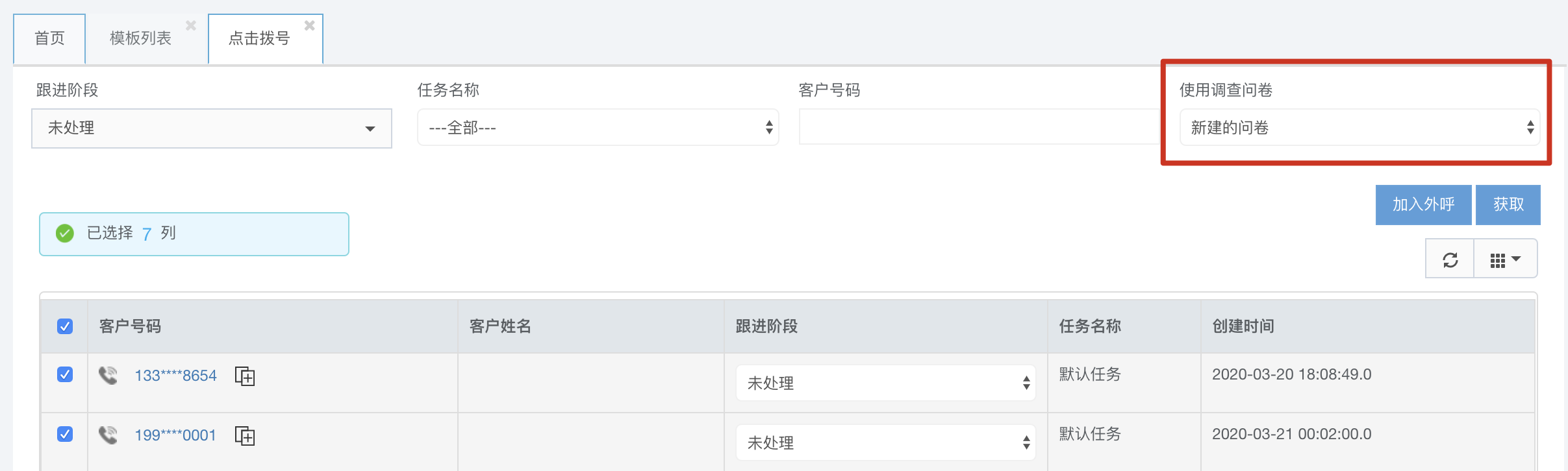 用户可以在建立预览式外呼时选择是否使用已发布的调查问卷