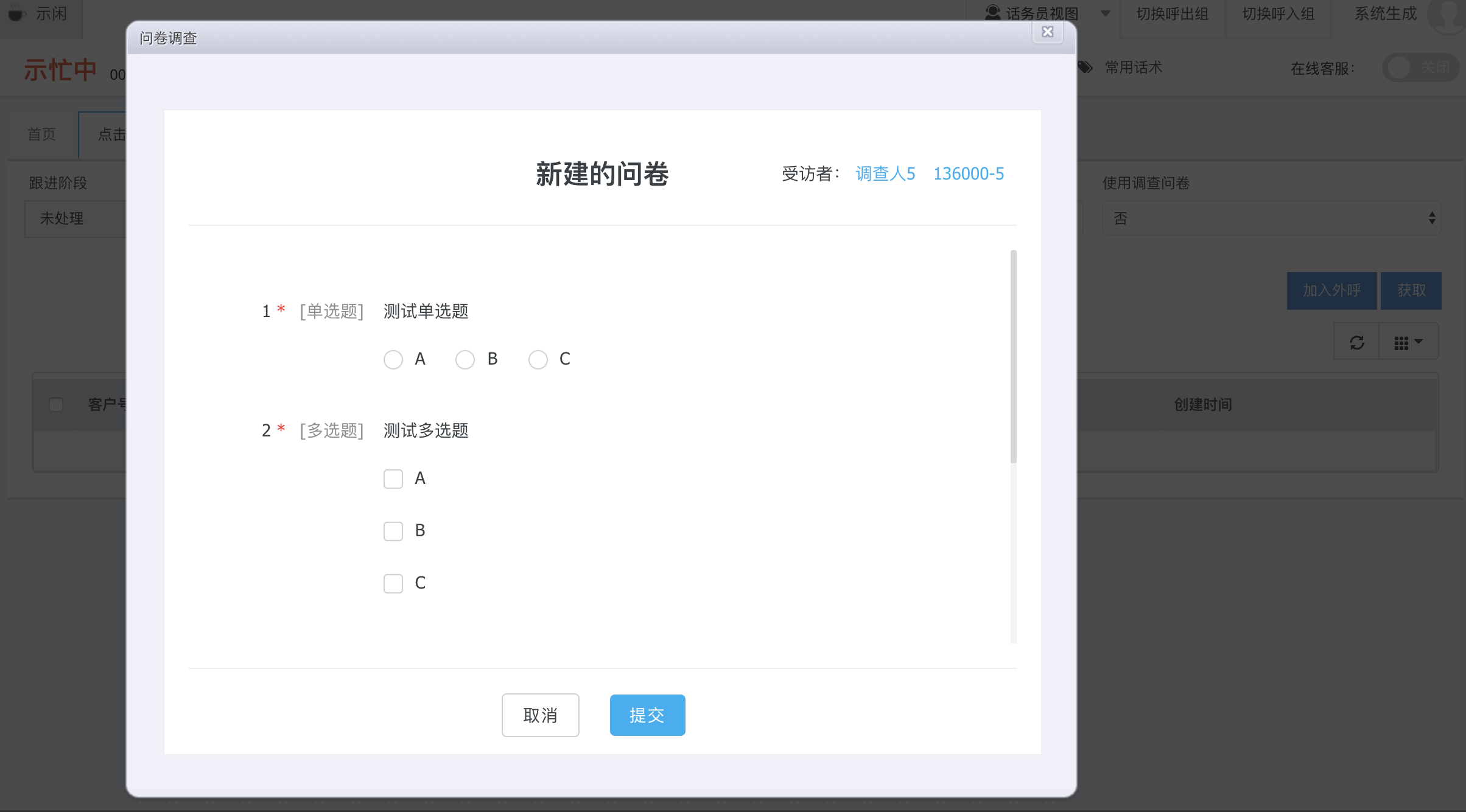 在接通受访者电话时,问卷会自动弹出,方便座席人员对受访者进行回访和记录答题