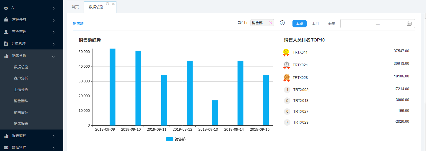 点击菜单“销售分析”-“数据总揽”,对销售业绩进行快速浏览。