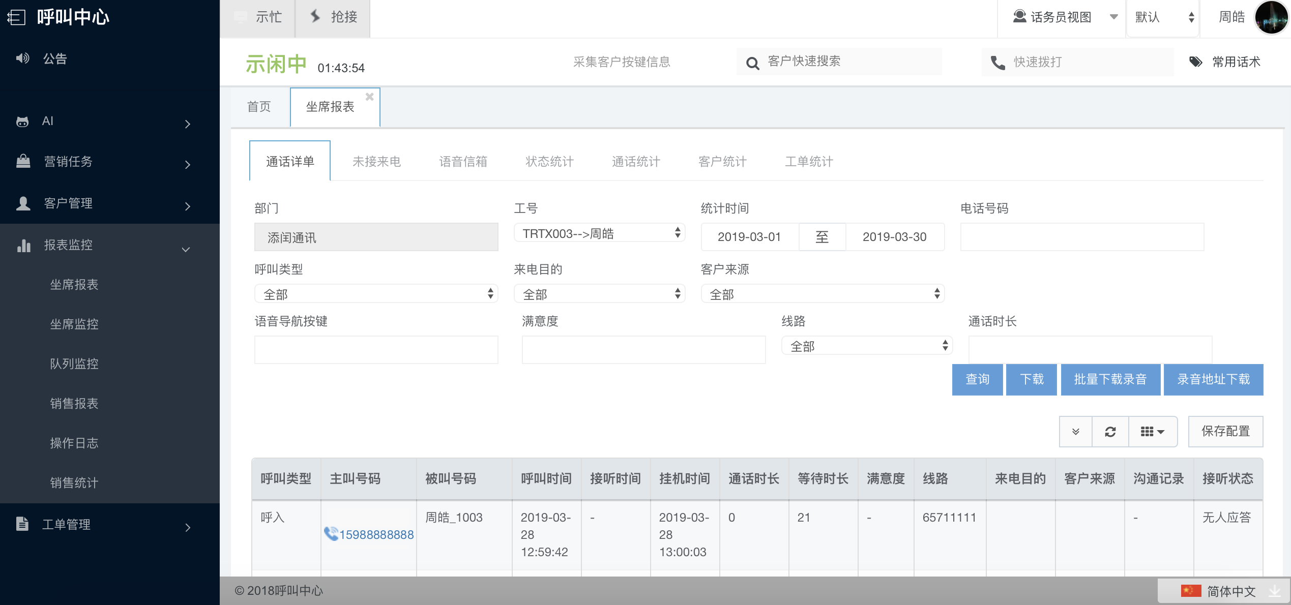 通过菜单树“报表监控—坐席报表”进入,点击“通话记录”标签。