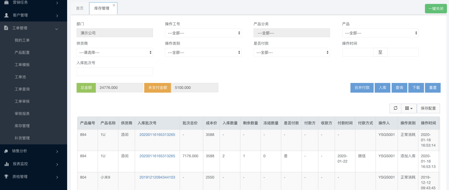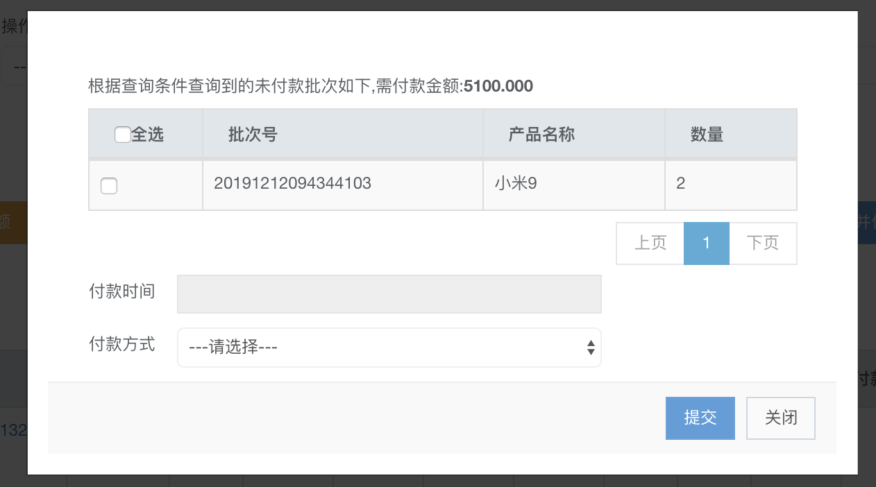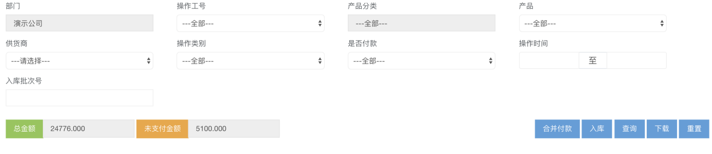 页面中的“合并付款”按钮是便于财务一次性的对未付款的入库批次进行付款的快速操作,系统将会自动选出所有未付款的批次,以供财务选择。