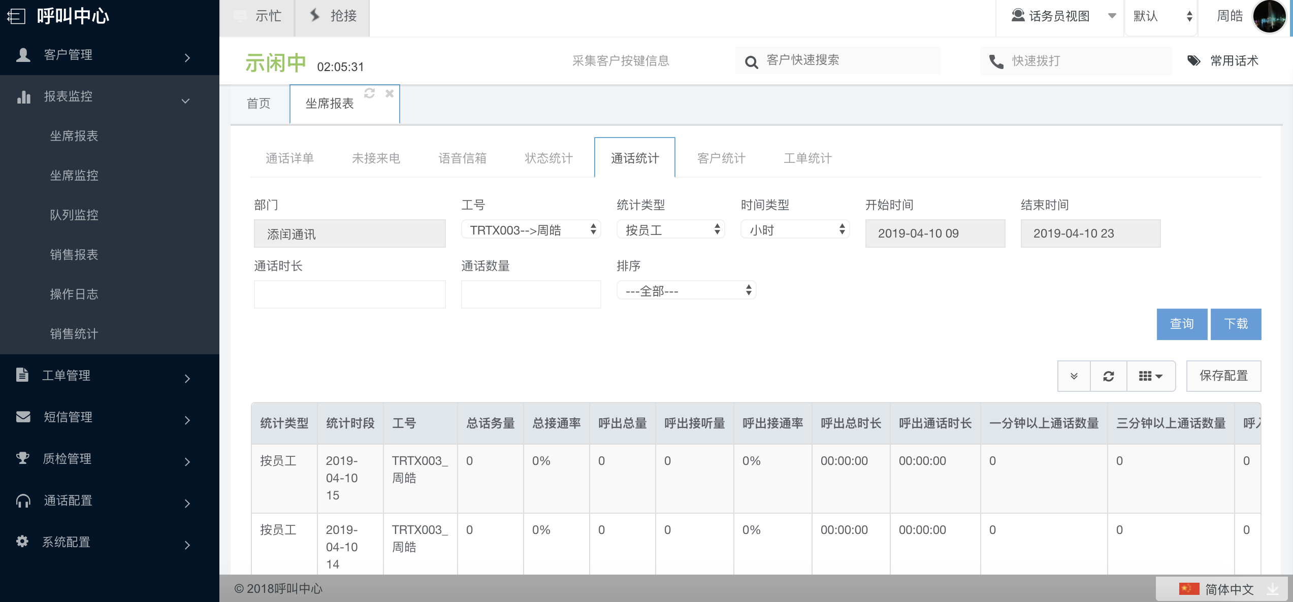 此模块可以统计员工的上下线,示闲示忙等工作情况。查询条件有部门,工号,按员工统计,按部门统计,时间类型(按小时、日、月),起止时间。