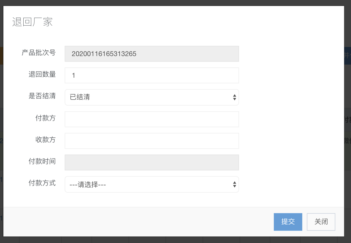 对于产品需要退回个供应商时,可以点击退回厂家按钮,并对此批次货款是否结清进行登记。