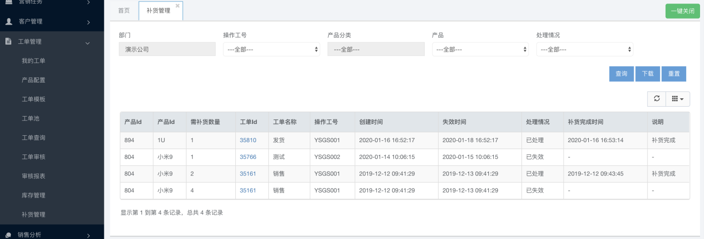 在销售型企业使用呼叫中心系统中的工单作为订单系统使用时,需要对产品的库存进行有效的管理和登记。做到有记录可查,不遗漏任何一条产品记录。13.2 补货管理
