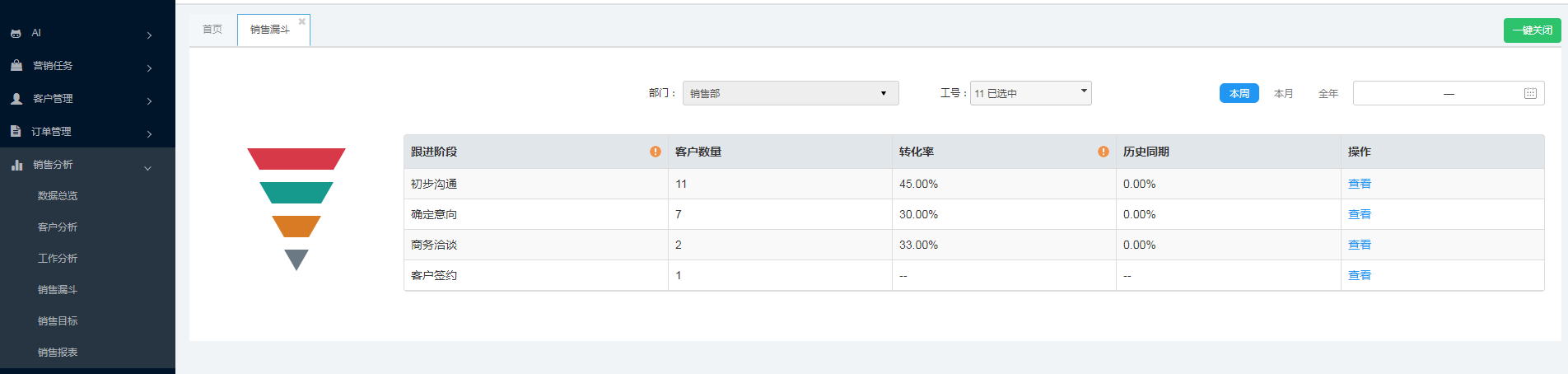 销售漏斗用于统计销售人员对客户的销售跟进过程情况,提供数据参考以提升客户转化率,提升销售业绩。