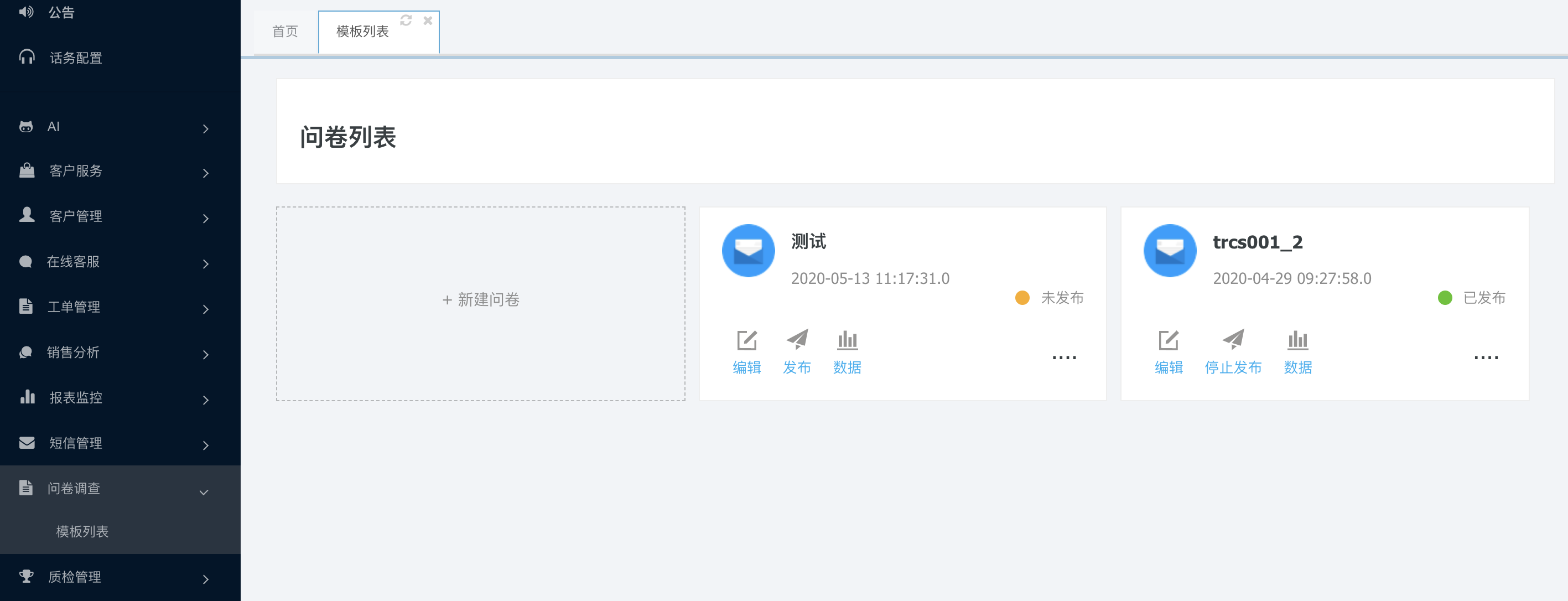 首先,通过菜单树“问卷调查—模版列表”进入,问卷的创建,编辑,发布及查看数据均在此操作。