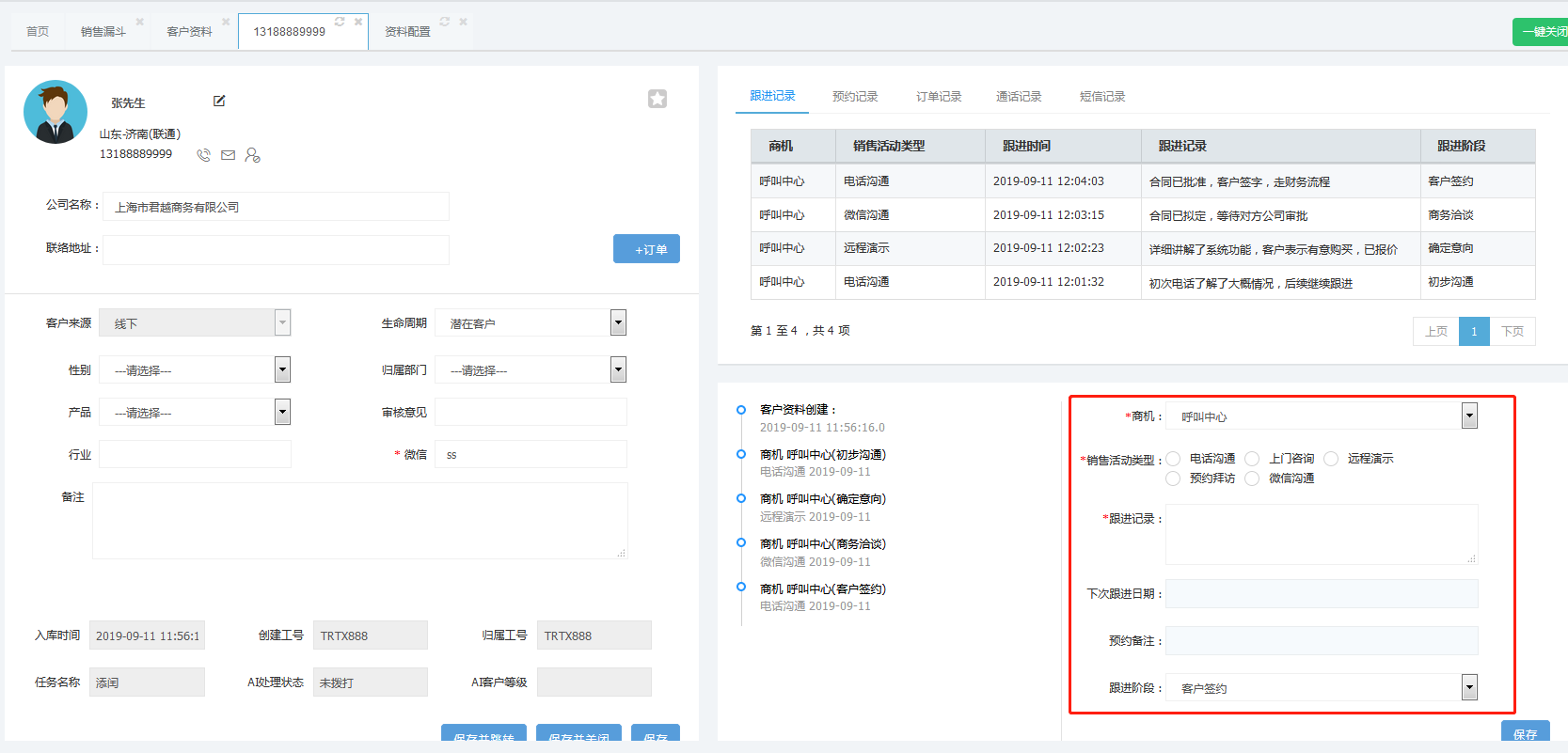 在客户资料的详情页面,有需要销售人员填写的跟进记录及当前所处的跟进阶段。