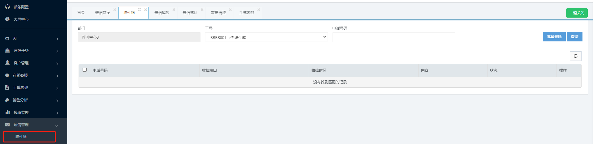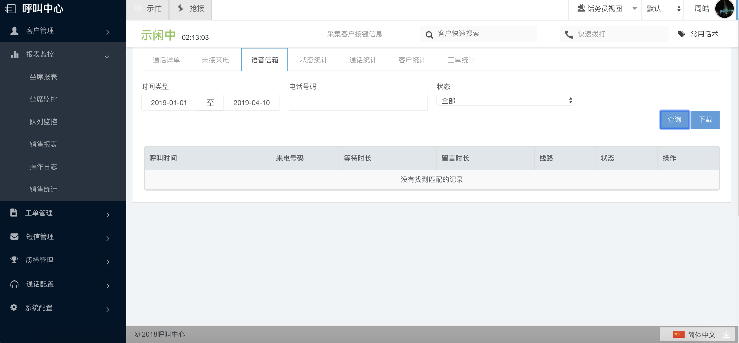 通过菜单树“报表监控—坐席报表”进入,点击“语音信箱”标签。