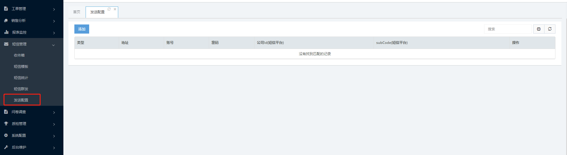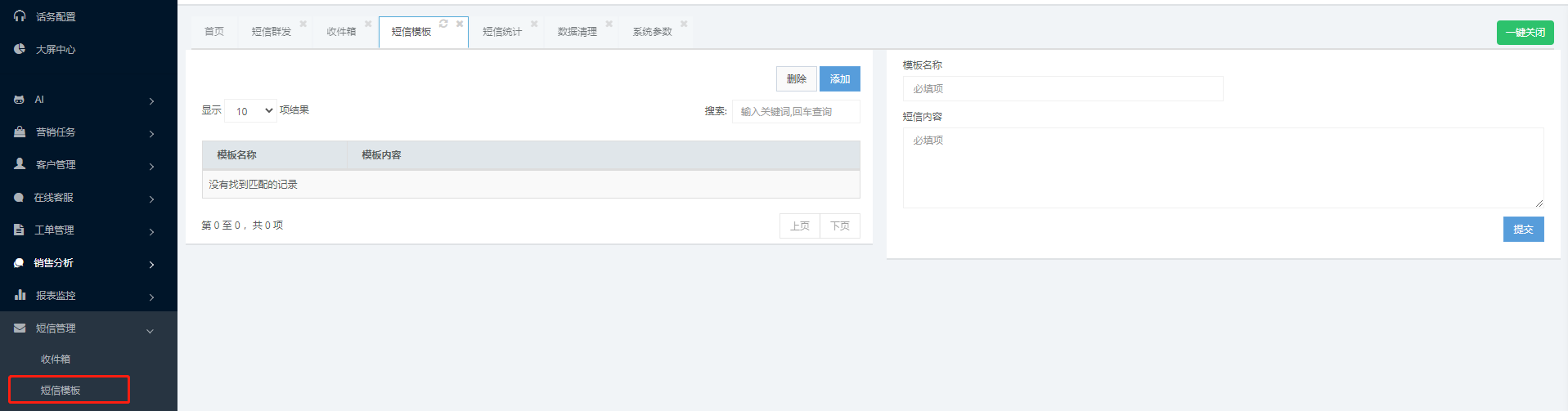 通过菜单树“短信管理—短信模板”进入,点击“添加”按钮增加短信模板。