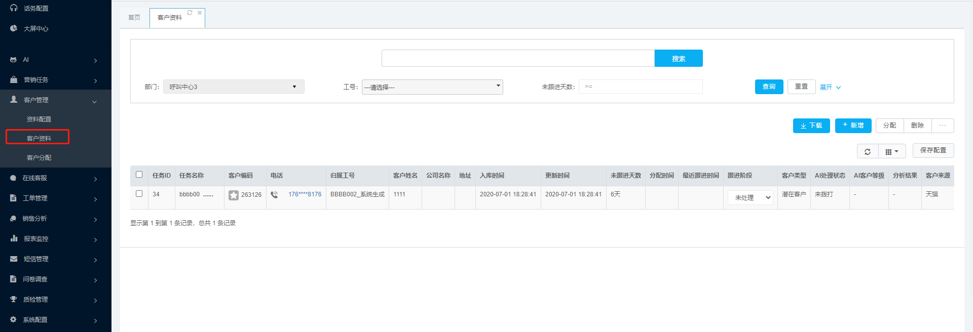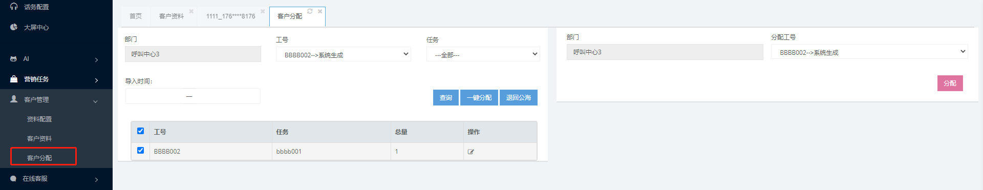 资料导入时默认是未处理状态需要将这些资料分配到员工进行处理,在此模块完成。客户分配支持按部门、工号、任务,资料导入时间搜索分配。支持一键指定分配,退回公海。