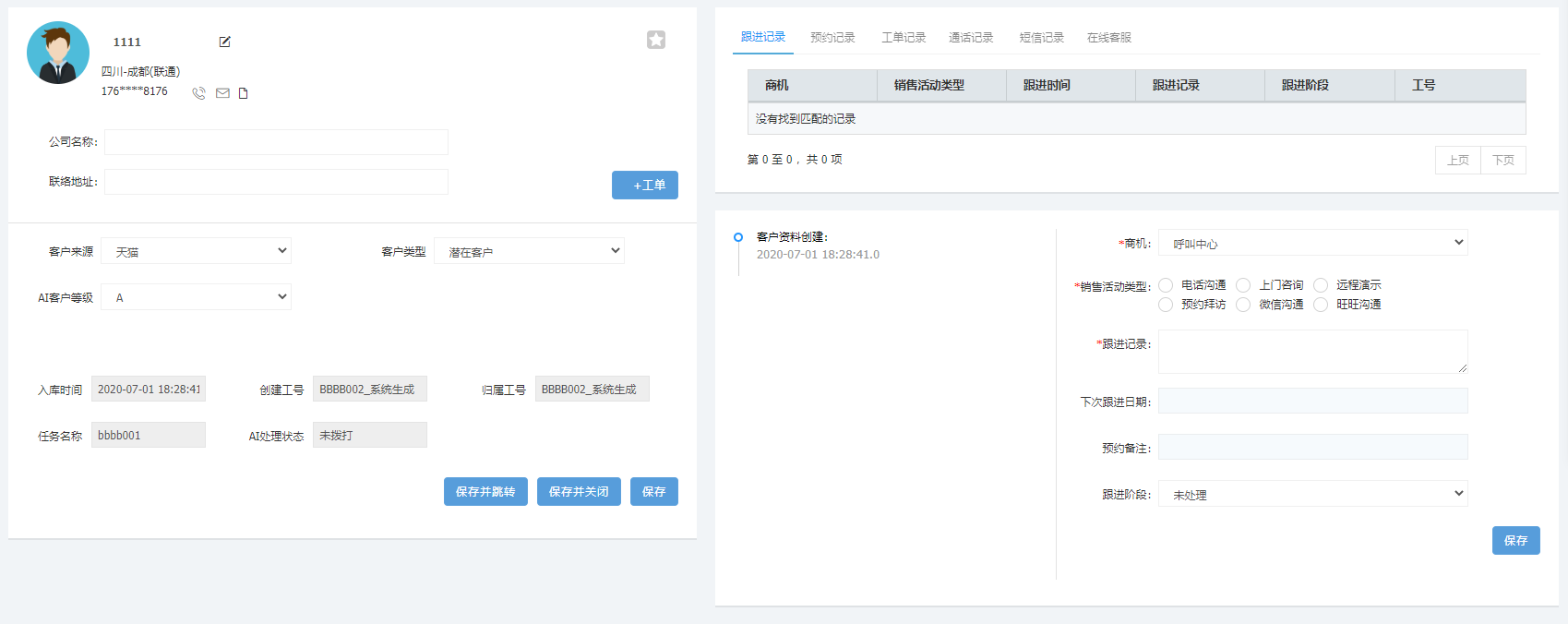 客户资料详情由客户的基本信息和客户的跟进情况历史记录构成,支持关联创建工单。