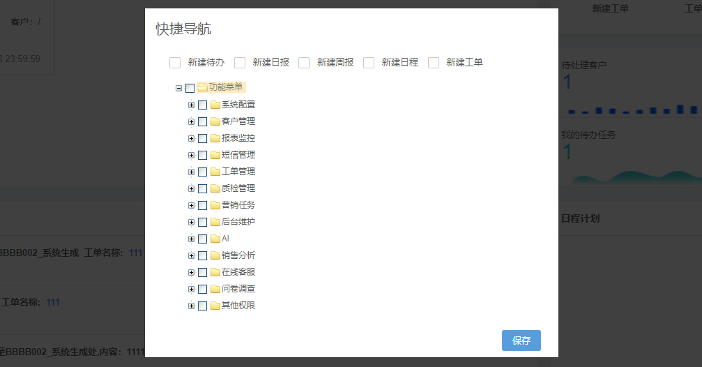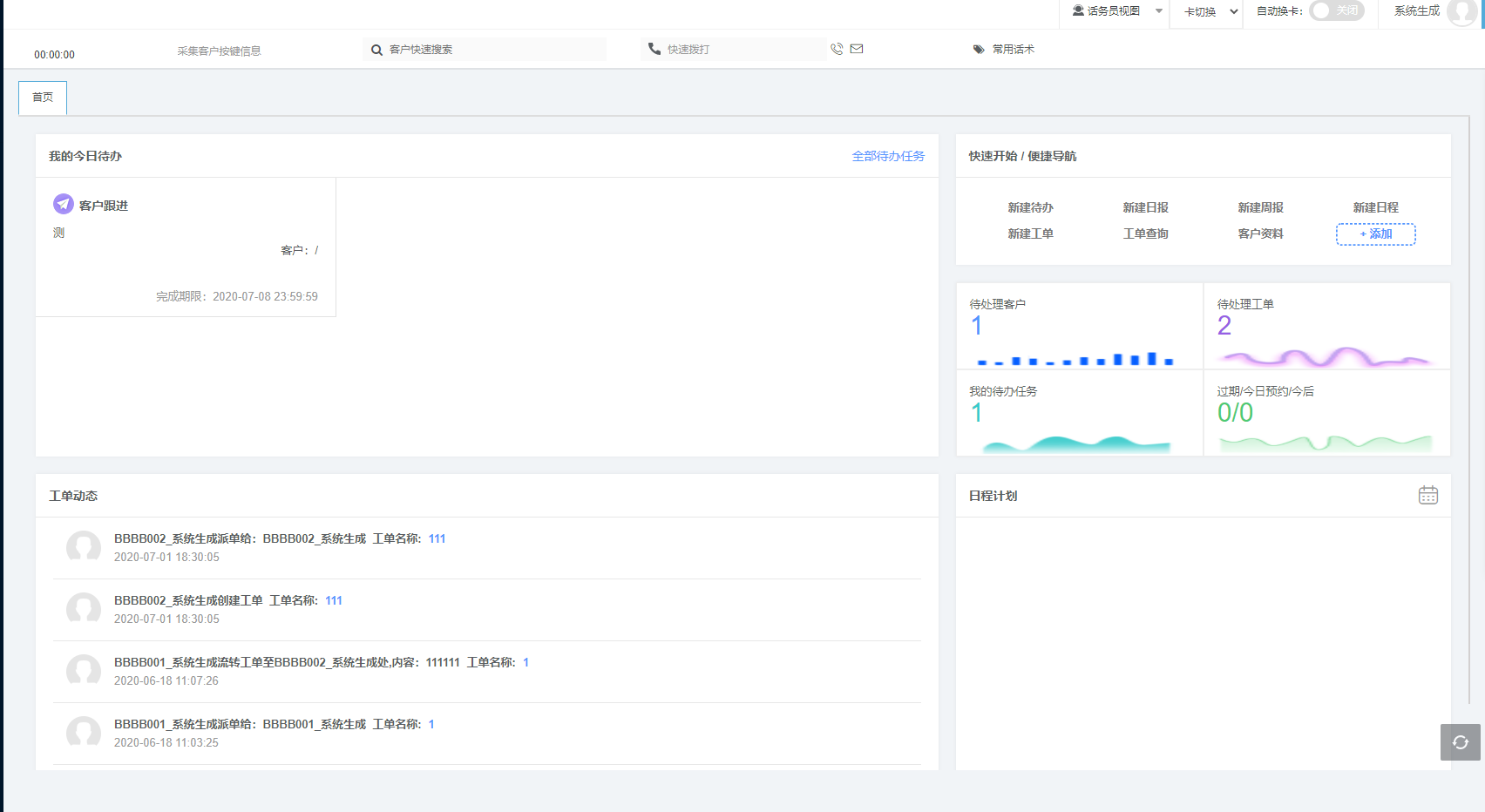 工作台包括待办任务、快捷导航、工单动态、日程计划、待处理统计、工作日志。