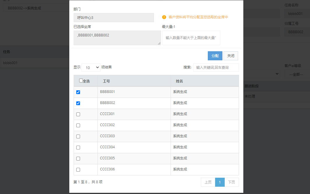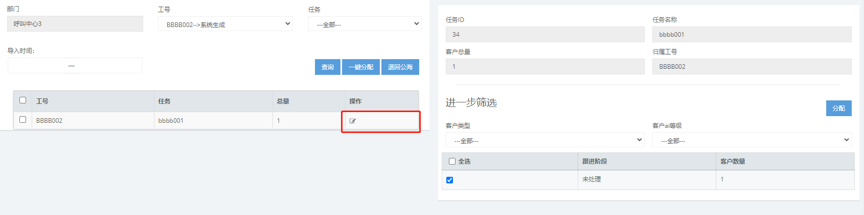 进入详情页面,可以按客户跟进状态指定分配数量,坐席平均分配到这些人。