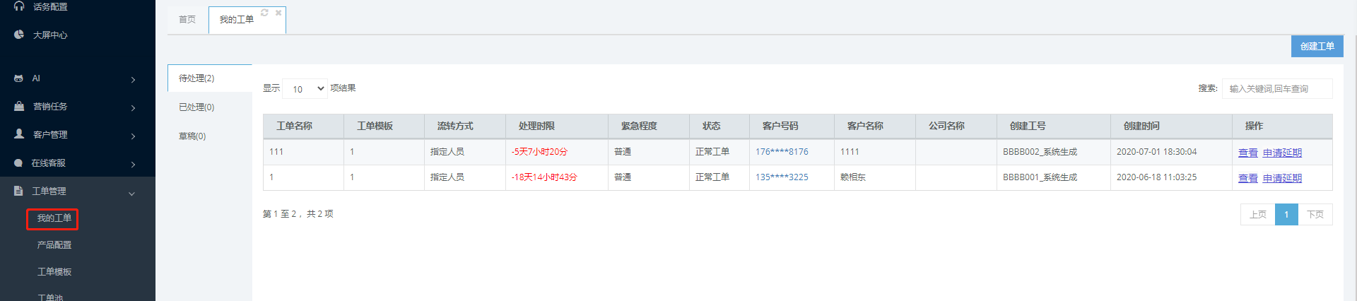 我的工单展示的我待处理,已处理以及草稿工单。支持创建工单,查看工单详情,若工单超时未处理可以申请延期处理。由主管审核。点击电话号码可跳转到客户资料详情。