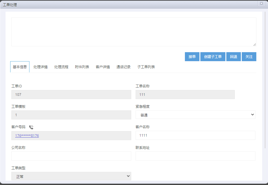 工单详情可以查看到客户的基本信息、处理详情、处理流程、附件列表、客户详情、通话记录、子工单列表。支持创建子工单。