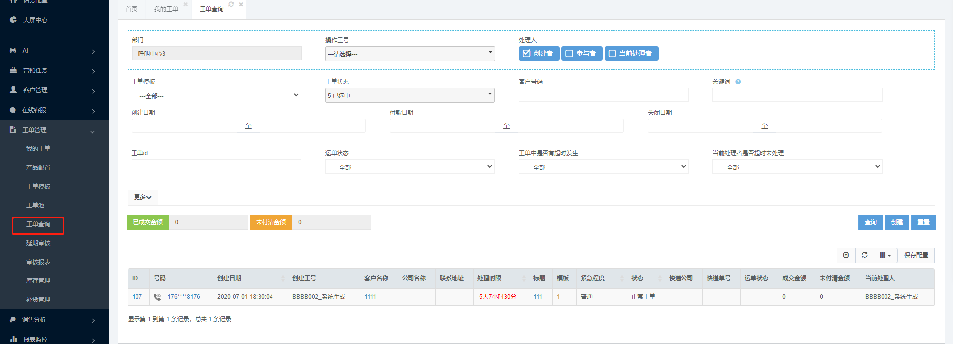 可以根据多条件查询到自己处理过、创建、待处理的工单。若存在快递单号可以点击单号查询物流信息。支持下载、创建工单。