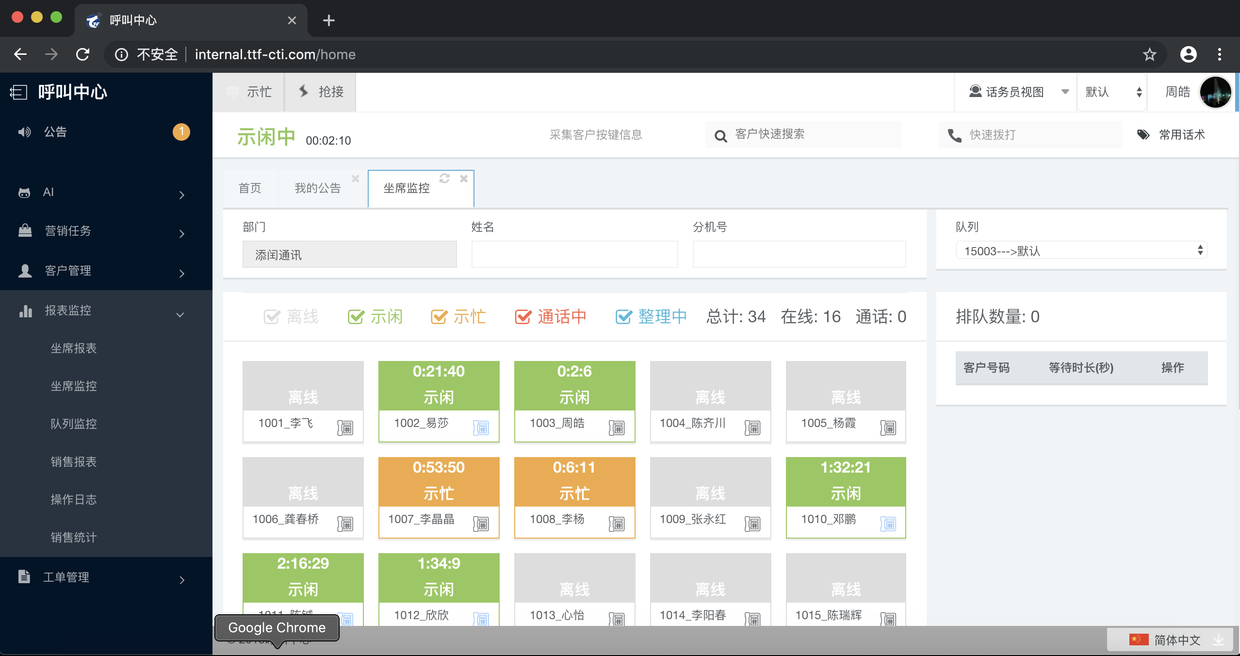 对于一个呼叫中心系统来说,坐席监控是不能或缺的功能。添添呼同样提供了强大的坐席监控模块。