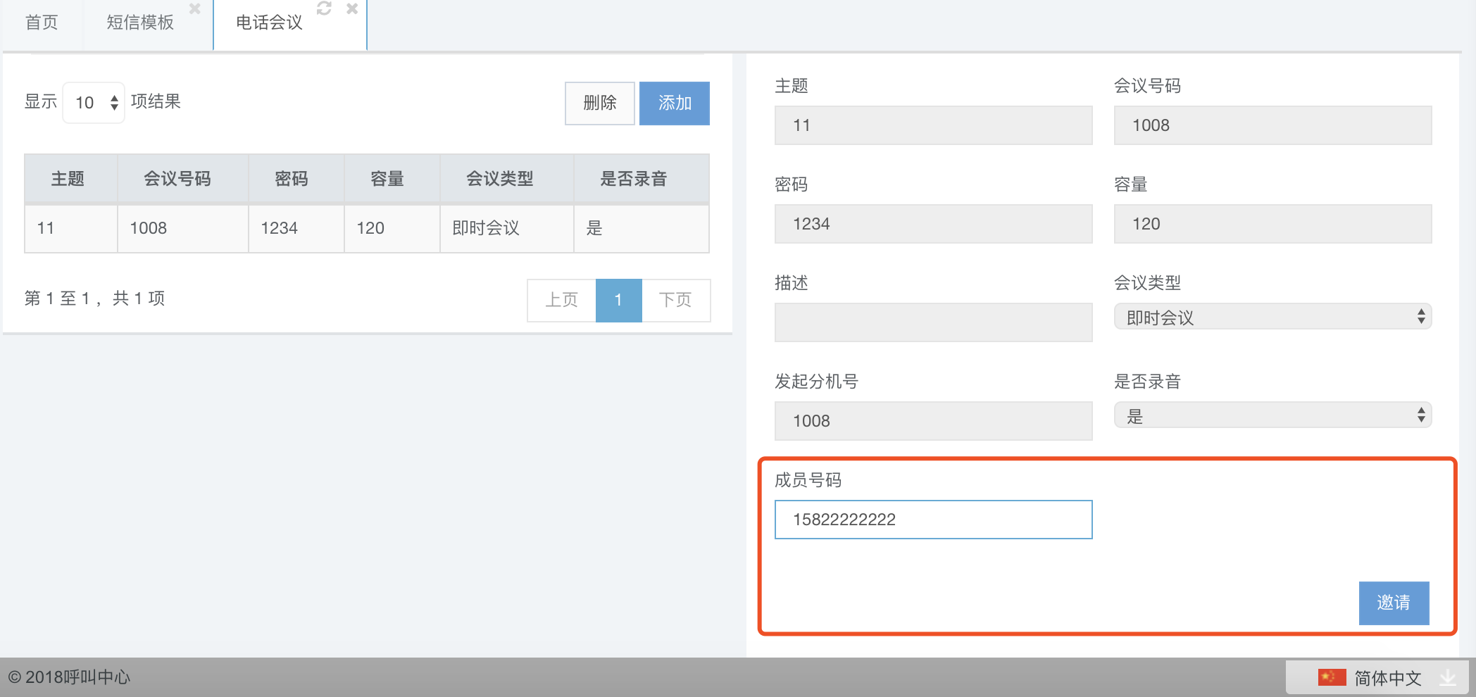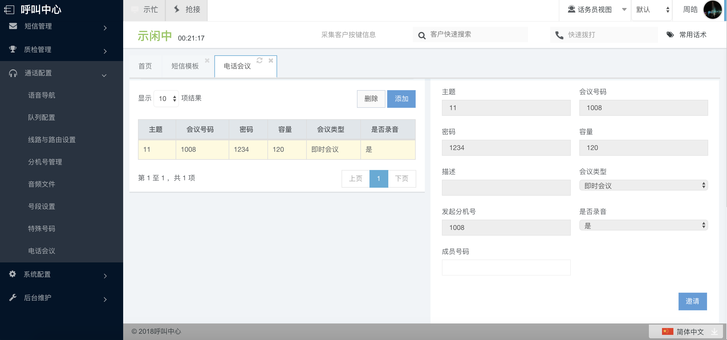 通过菜单树“通话配置—电话会议”进入,点击“添加”按钮增加会议室。
