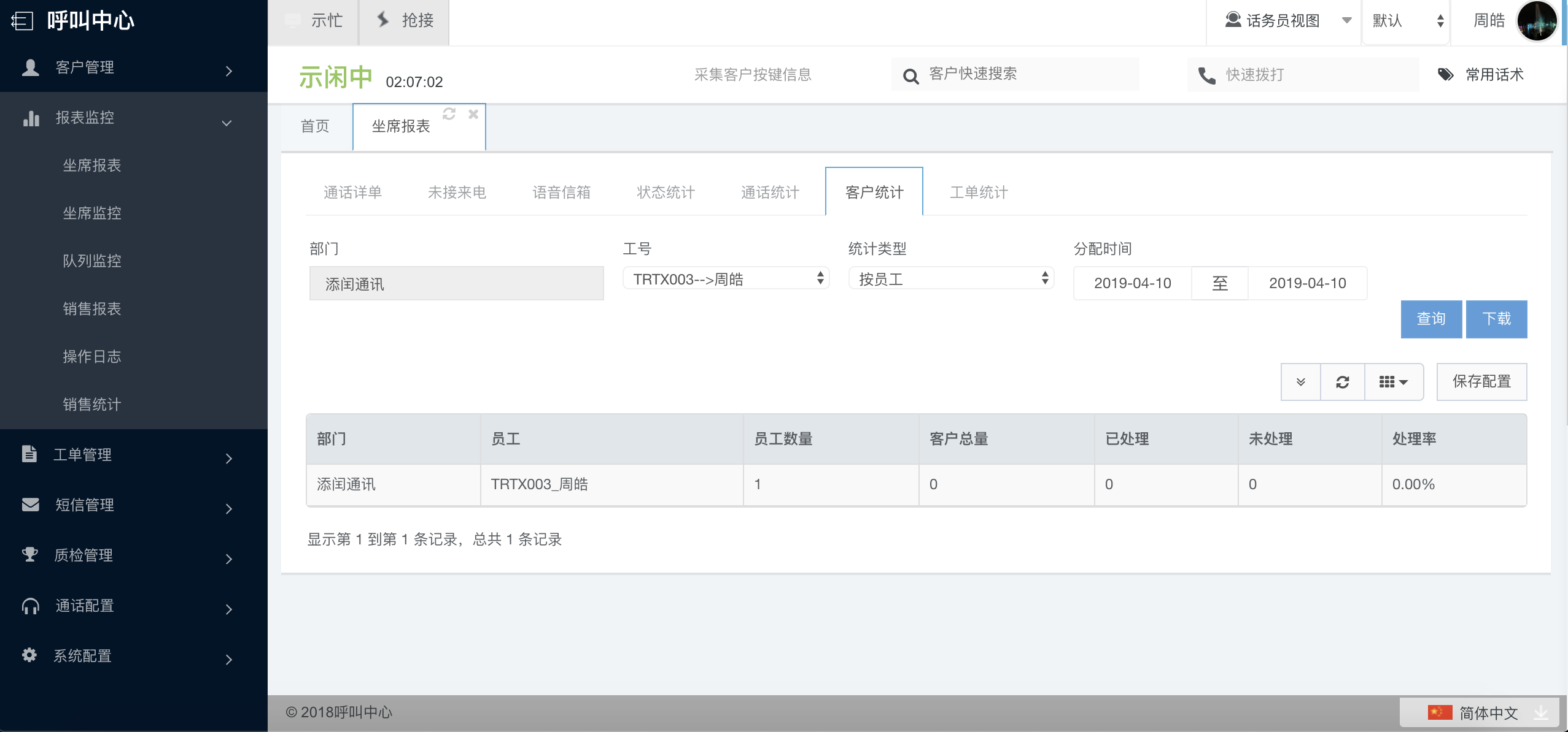 通过菜单树“报表监控—坐席报表”进入,点击“客户统计”标签。