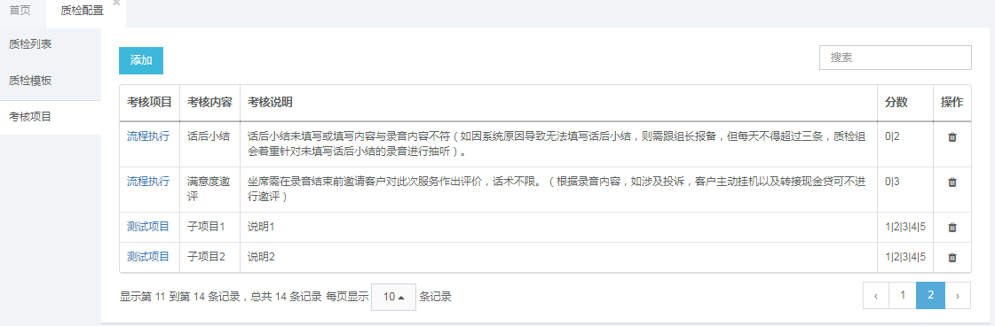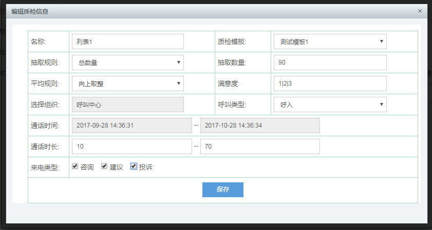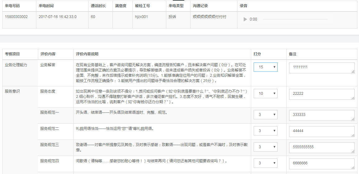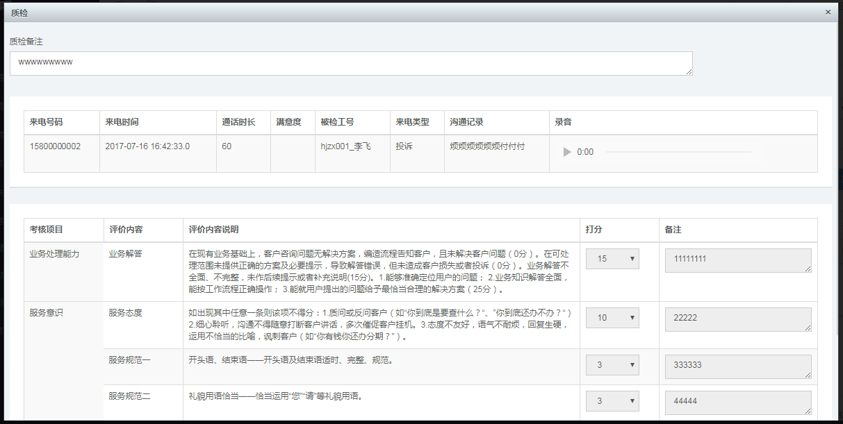 质检页面中可以播放录音,根据通话情况对预设的质检项目进行评分,点击“保存”完成质检。