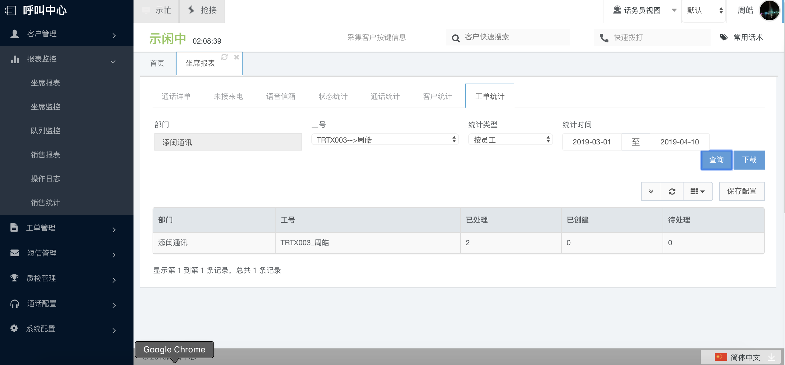 通过菜单树“报表监控—坐席报表”进入,点击“工单统计”标签。