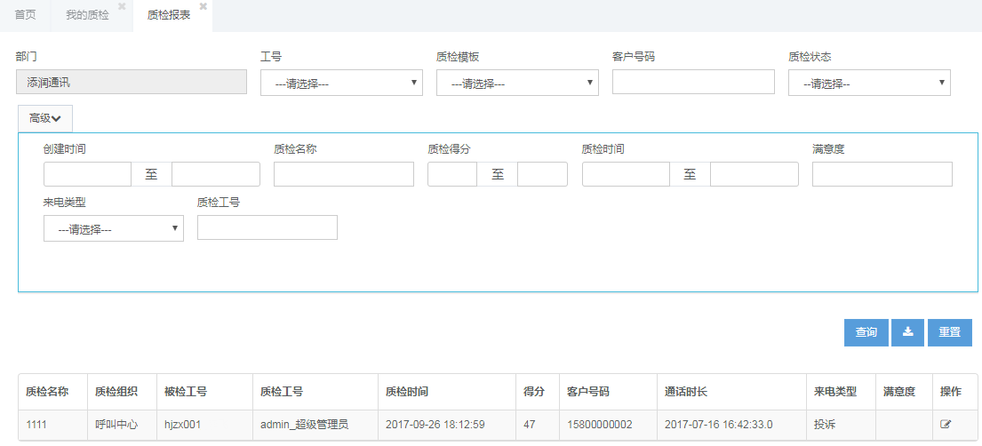 质检工作开始后,可以实时查看质检情况。通过菜单树“质检管理—质检报表”进入,点击“查询”。