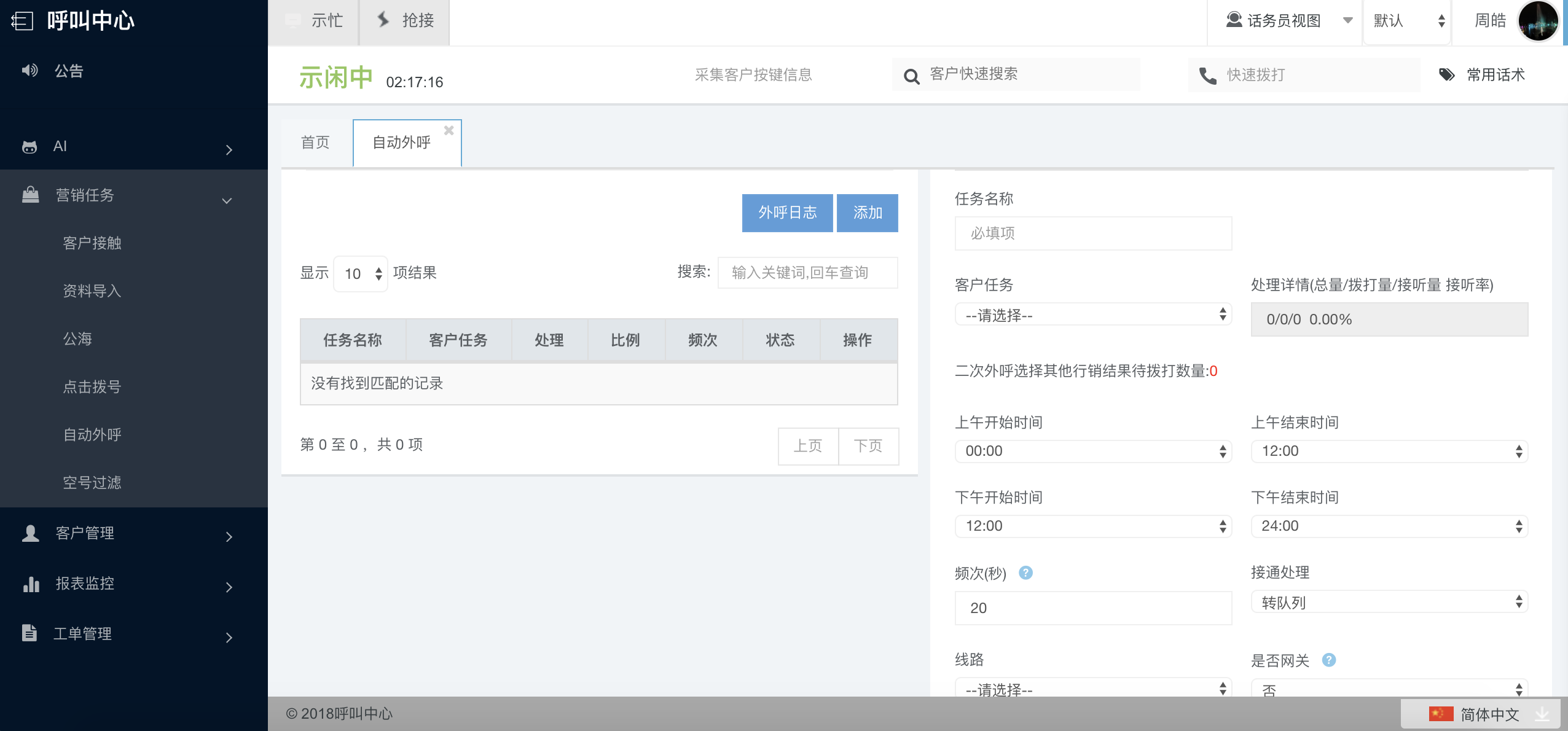 通过菜单树“营销任务—自动外呼”进入,点击添加按钮。