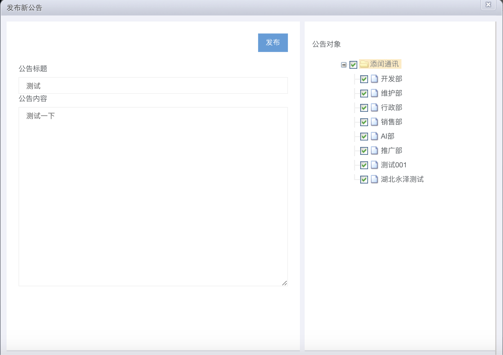 输入公告标题和内容后,选择要发布的部门。点击发布。被发布公告的部门下面的所有员工,菜单树上方的公告处会自动弹出新公告提示,点击这个数字可以进入公告列表查看。