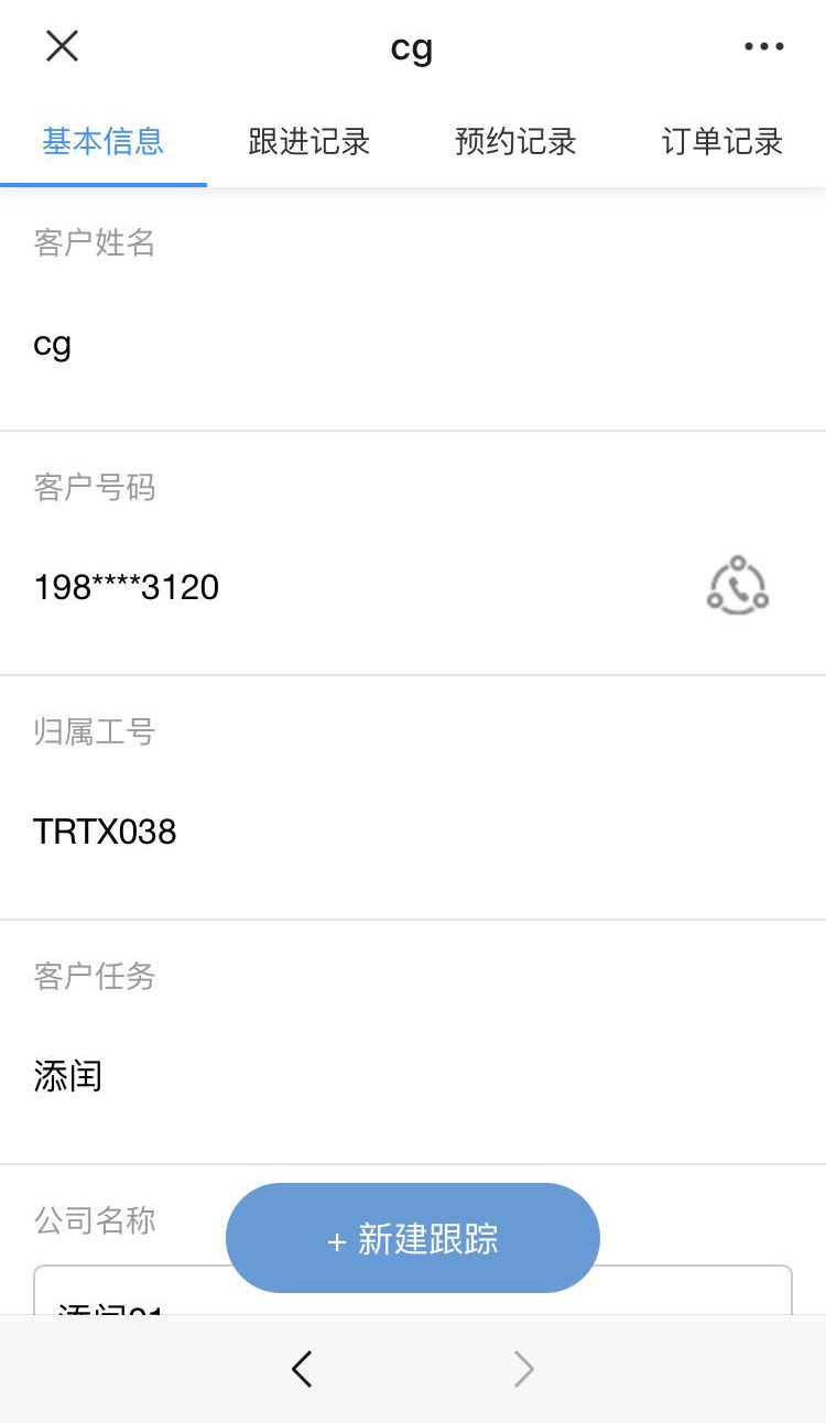 客户资料展示自己已有的客户,可以根据客户姓名,电话,公司名称进行搜索,点击客户资料可一查看客户详情。基本信息、跟进记录、预约记录、订单记录、短信记录、通话记录。点击“新建跟踪”可以添加跟进跟进。