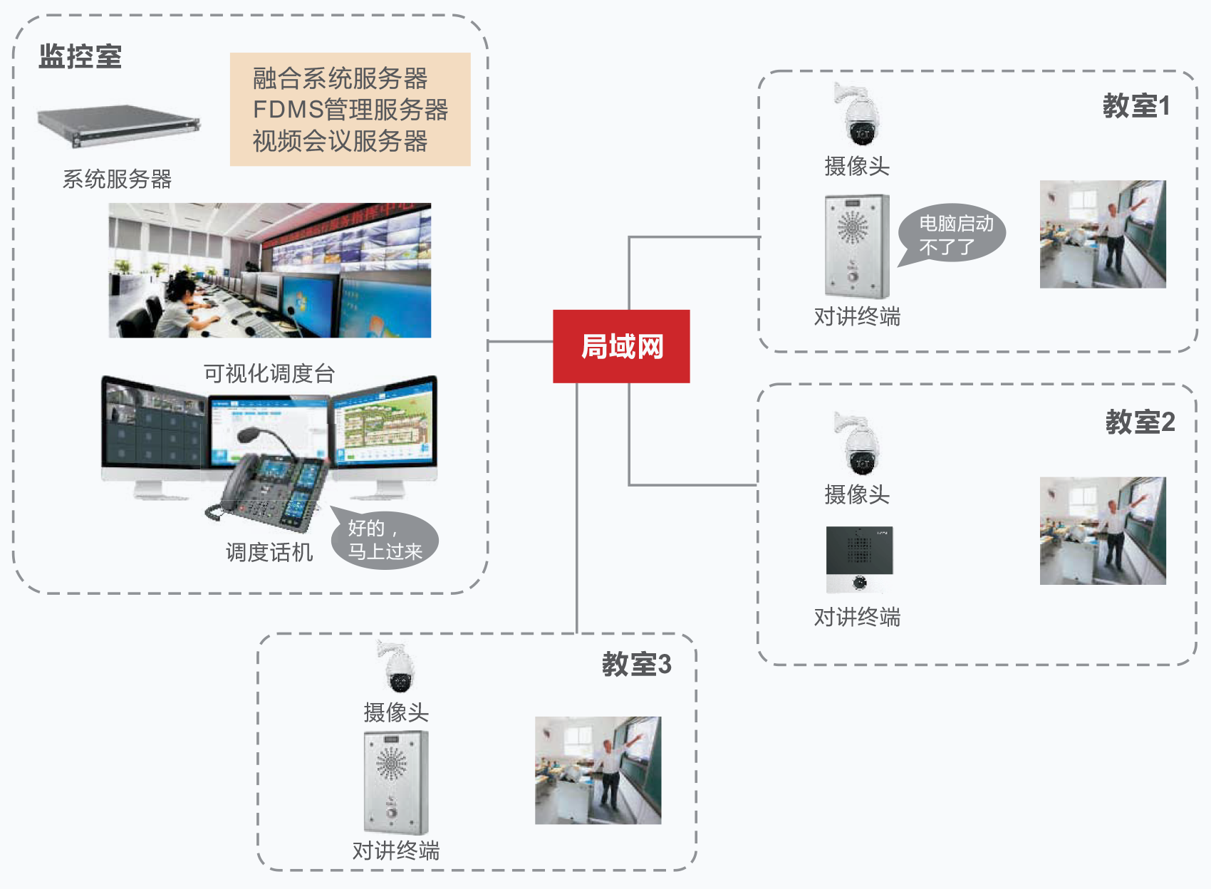 当教室设备遇到故障时,老师可通过对讲终端一键呼叫监控室维护人员获取远程指导。对讲终端同时可与教室的IP摄像头联动,方便维护人员更好的了解现场情况,有助于快速排除故障。