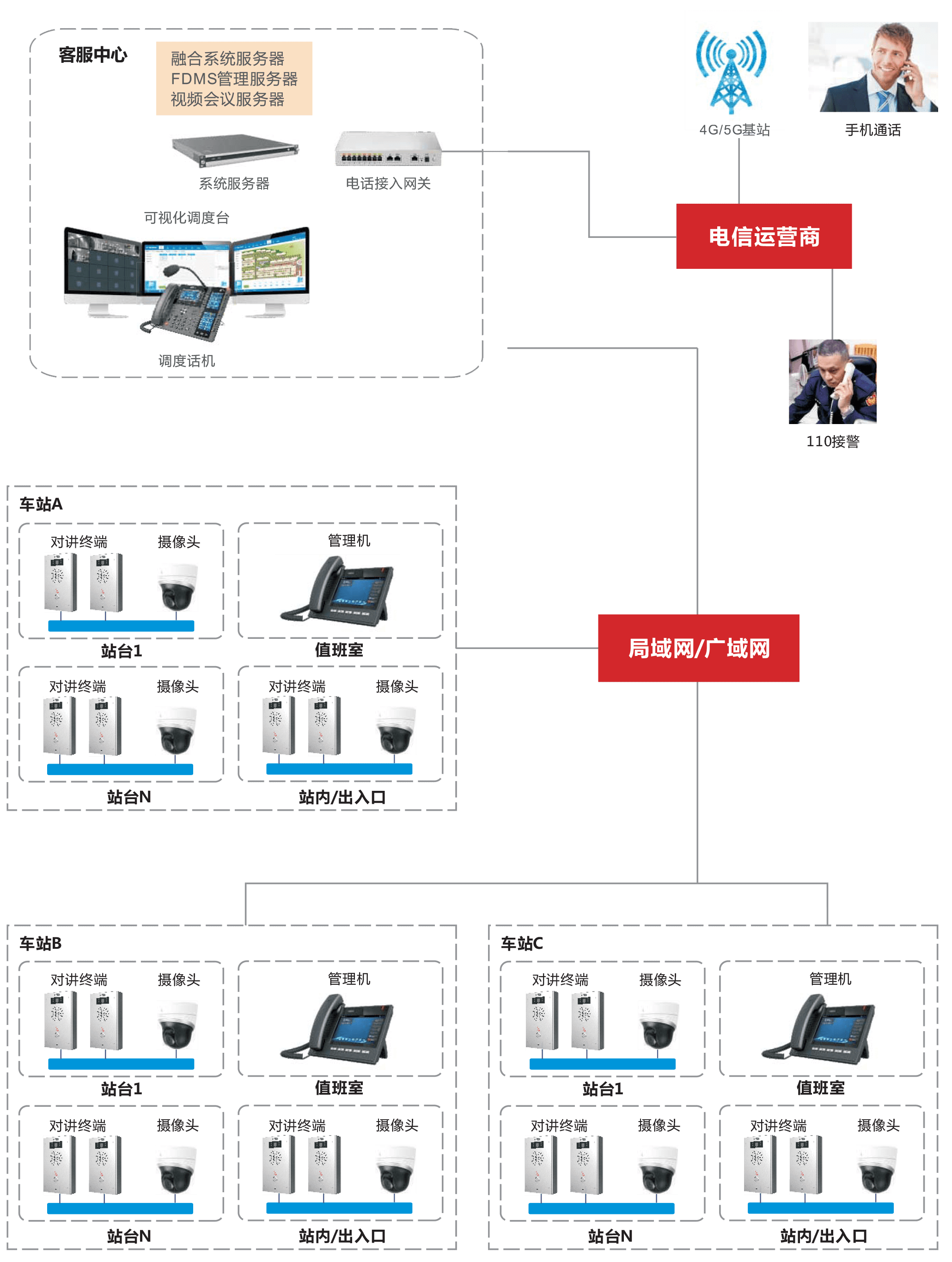 在车站客服中心设置可视化调度台、调度话机作为指挥系统,统一管理车站各公共区域的招援求助对讲终端。在车站站台,站厅及出入口设置招援求助对讲终端,供乘客在紧急情况下与客服中心或车站值班员联系。客服中心遇到乘客报警求助时,可通过可视化调度台实时观看求助对讲终端视频快速判断现场,确定报警者状况,并及时联动相关部门,如就近医,及时给乘客提供必要的帮忙。