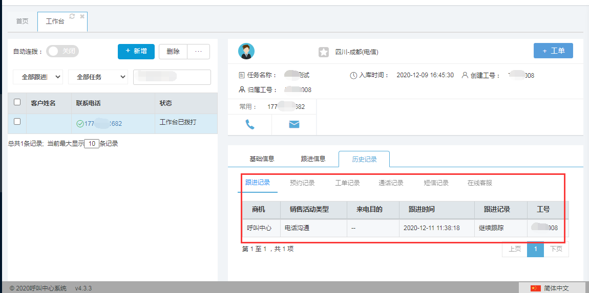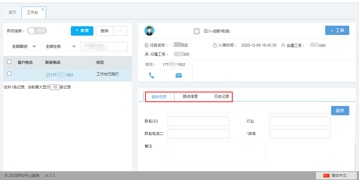 工作台上数据信息包含基础信息,跟进信息和历史记录信息。方便坐席人员直观的看到这些详细信息。坐席人员在通话的过程中,可以查询以前的历史记录信息,方便坐席对老客户回访的时候明确了解到以前的跟进记录,可以直接对该条资料数据进行完善记录。如下图所示: