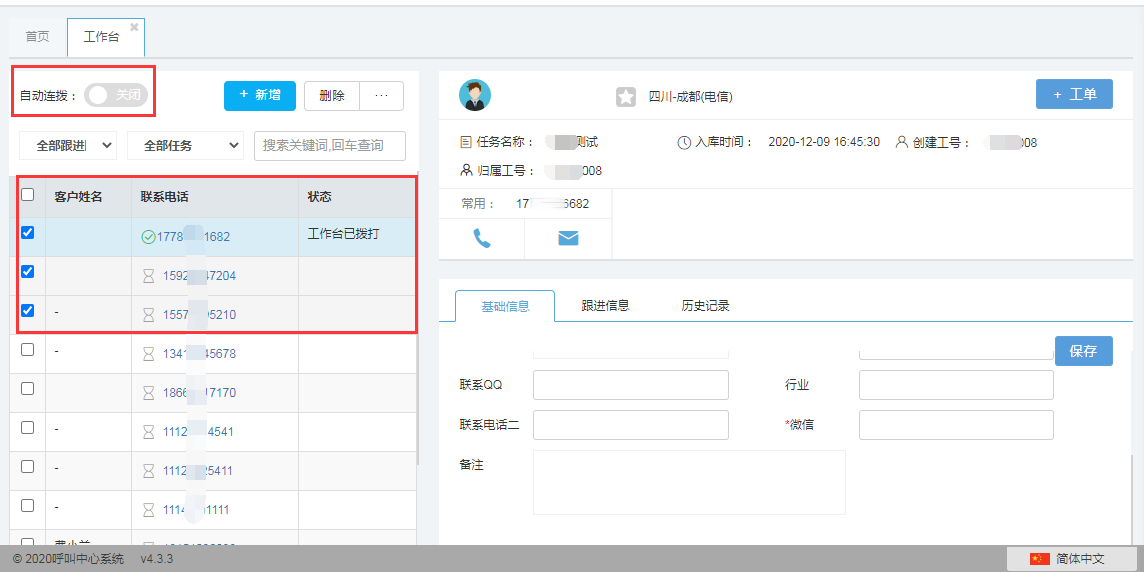 该功能的主要特色就是坐席人员可以选择上需要外呼的数据,开启自动连呼选项之后,通过系统后台发起呼叫。坐席人员只需要通过话机接听就行,这样可以省去坐席手动外呼的操作,让坐席有更多的时间去完善客户资料信息,做对应的跟进记录信息 。如下图所示: