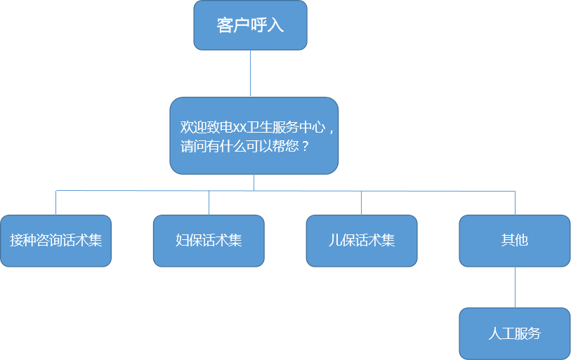 客户呼入主要分为接种咨询、妇保、儿保这3类意图,通过项目管理模块将这3类的话术集配置到系统,并进行训练。客户呼入时机器人会通过算法对话术进行匹配,匹配上了就直接进行回复,若未匹配上,则会进行引导。引导失败则转入人工服务。流程如图所示: