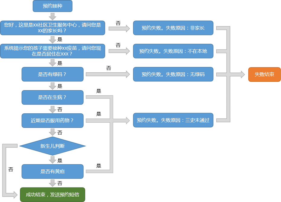 对客户导入的儿保数据进行AI机器人外呼,对预约成功的客户自动发送预约短信,短信中附有url地址,客户点击地址进入预约界面进行预约。流程如图所示: