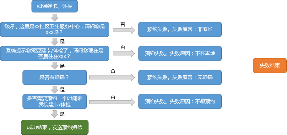 对客户导入的妇保数据进行AI机器人外呼,对预约成功的客户自动发送预约短信,短信中附有url地址,客户点击地址进入预约界面进行预约。流程如图所示: