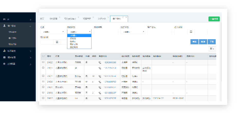 客户可根据预约状态、拨打状态、号码,汇入日期等等筛选条件,对外呼号码进行筛选,可对筛选出的号码进行人工拨打,人工预约。点击号码,可进入客户详情页面,该页面中可对客户资料进行修改,可进行预约。