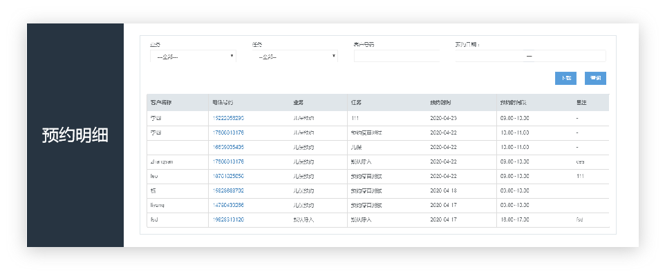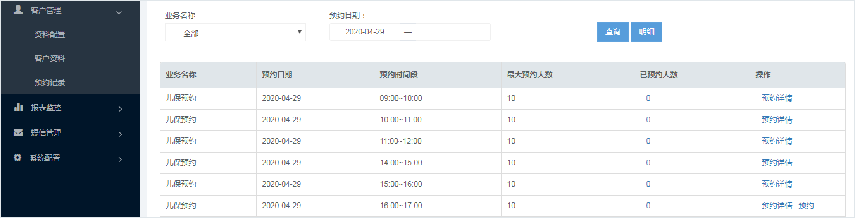 客户可在此模块查看各个时段的预约情况和预约详情,有下载权限的工号可下载。