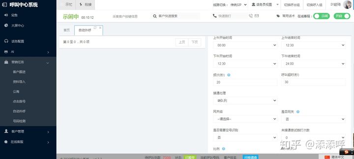 管理员创建自动外呼任务,导入需要外呼的数据。可以通过系统导入,也可以通过三方接口导入,设置外呼的时间范围,例如早上九点至中午十二点,下午两点至下午六点,在这段时间内通过系统检测,全自动外呼数据,客户接通后在转到人工坐席,极大的提高了坐席的通话效率,降低了企业的人力成本。系统同时提供了强大的报表功能,实时监控任务的执行情况,包括总数据,未拨打,未接通,已接通等。