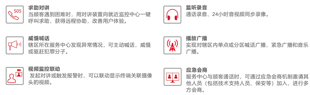 在入门扫码区域、自动结算区域、出门自动核查区域安装紧急求助对讲终端,在发生紧急状况时,顾客可及时向服务中心求助,提升无人值守超市的用户体验。